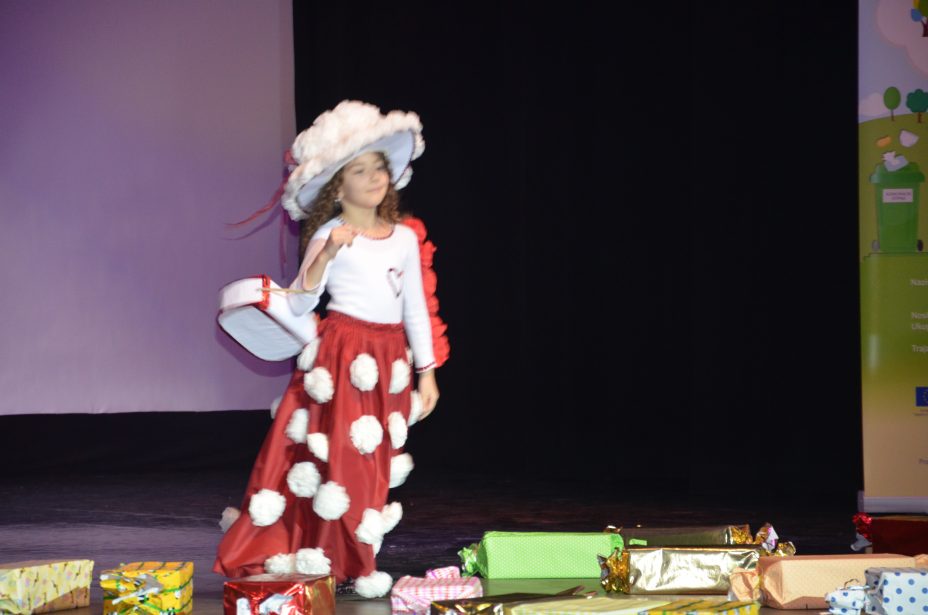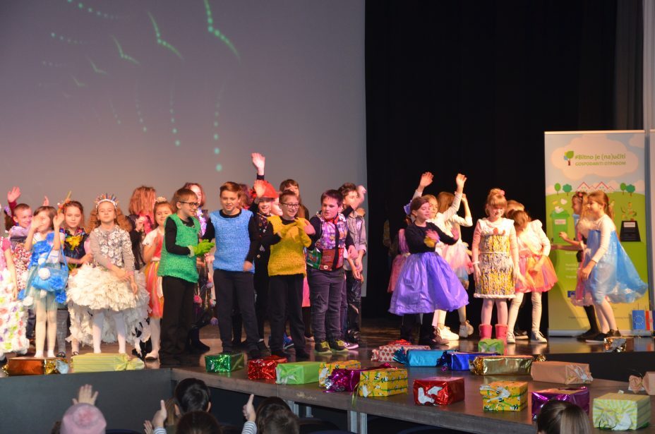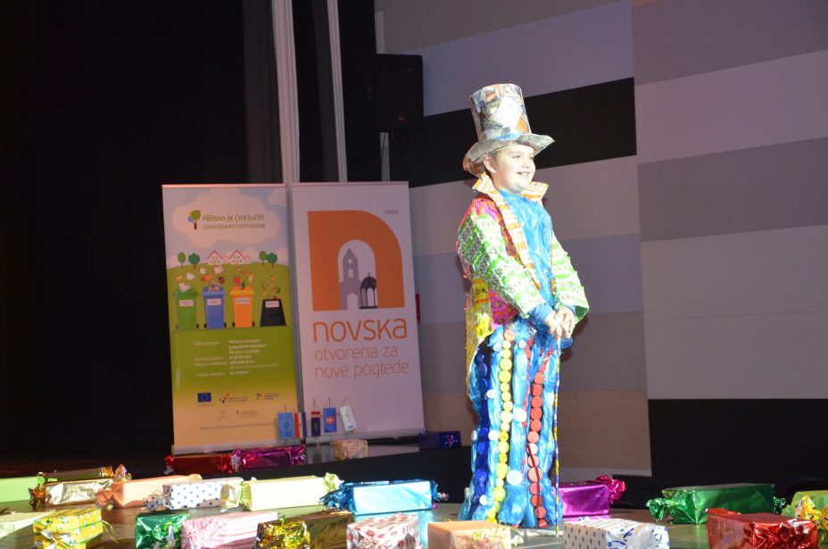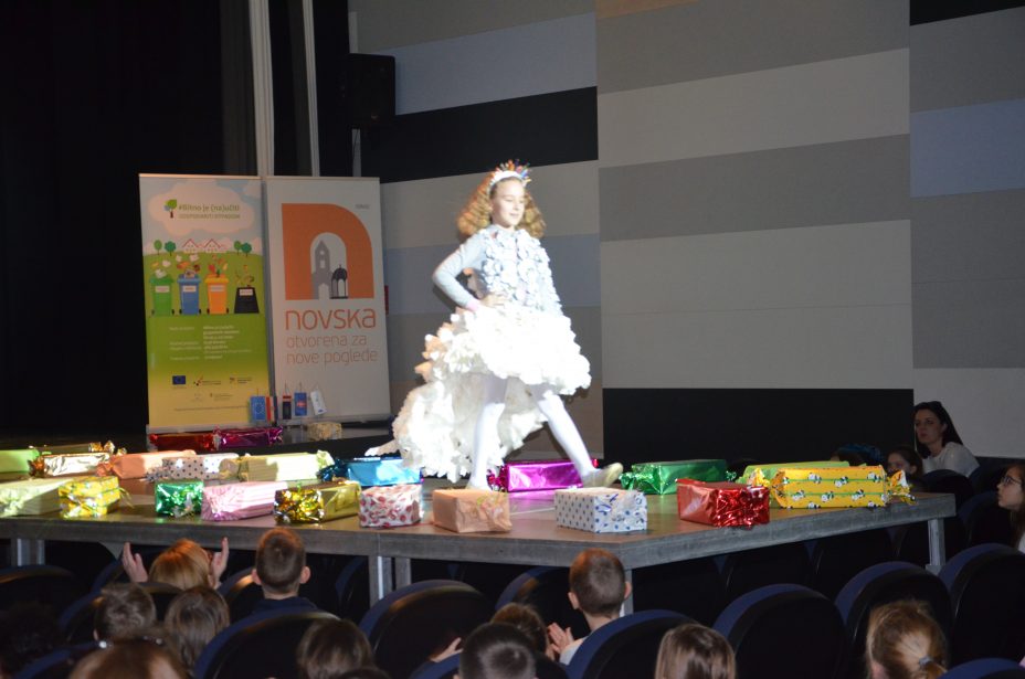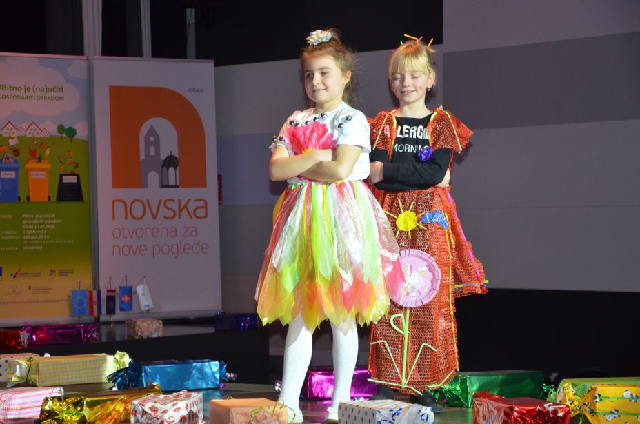 Što su naučili o razvrstavanju i recikliranju otpada te kako ga iskoristi za izradu novih predmeta, pokazali su učenici Osnovne škole Novska. Oni su pripremili modnu reviju na kojoj su nosili odjeću napravljenu od plastičnih vrećica, čepova, papira i drugih materijala koji se najčešće odbacuju u kante za otpad. Osim toga, pripremili su i izveli odličan igrokaz na temu otpada „O okolišu brini, otpad pravilno zbrini”.