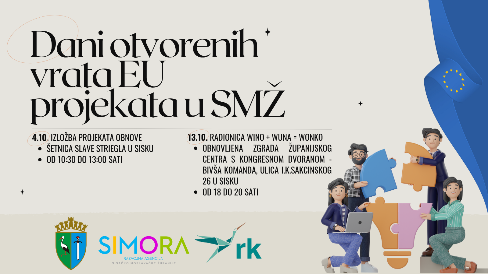 Dani otvorenih vrata EU projekata održat će se u dva termina, a prvi je već 4. listopada na Šetnici Slave Striegla u Sisku. Organizatori pozivaju građane da dođu, pogledaju izložbu, sudjeluju u kvizu i radionici, te iz prve ruke saznaju što sve europski projekti znače za razvoj Sisačko-moslavačke županije.