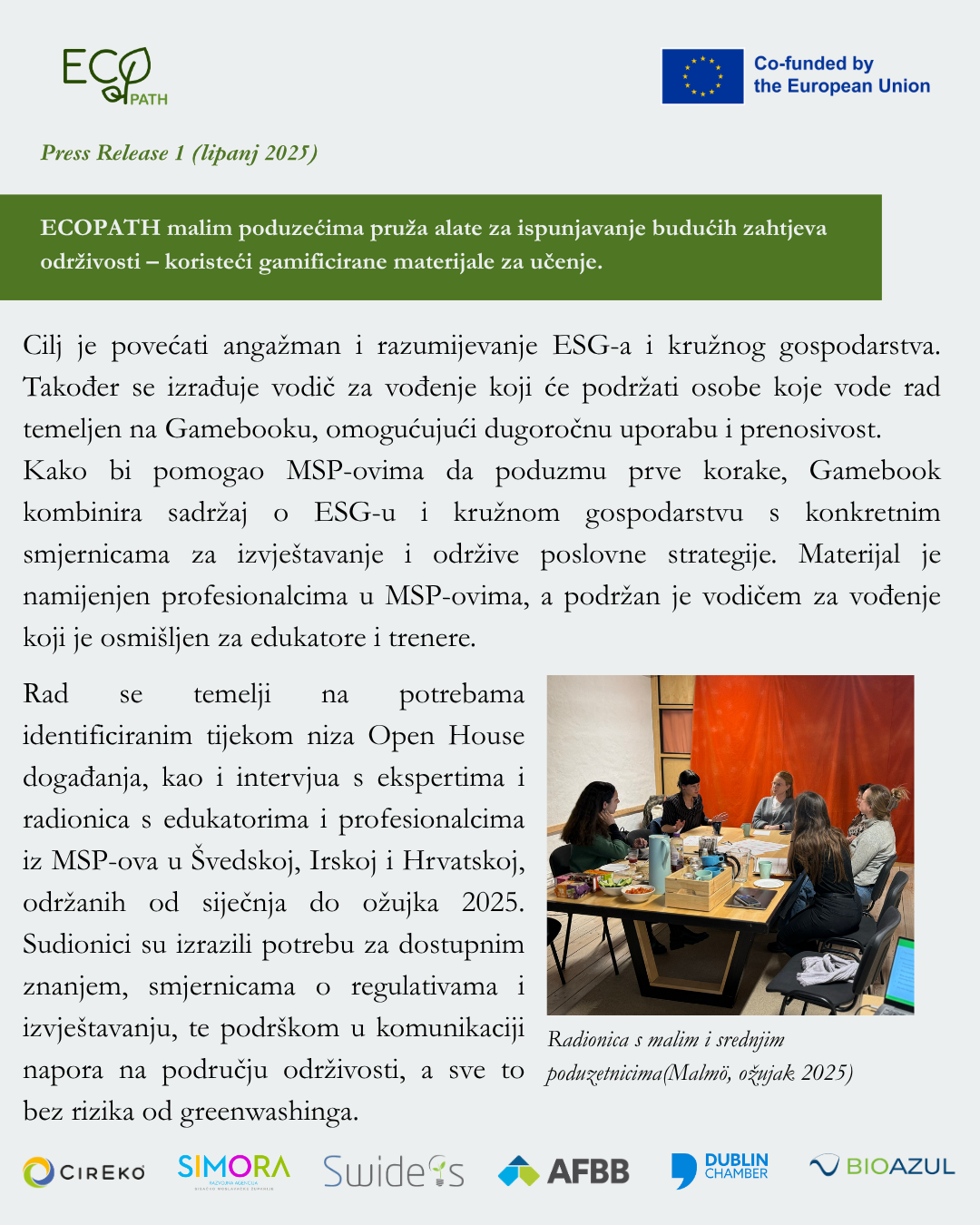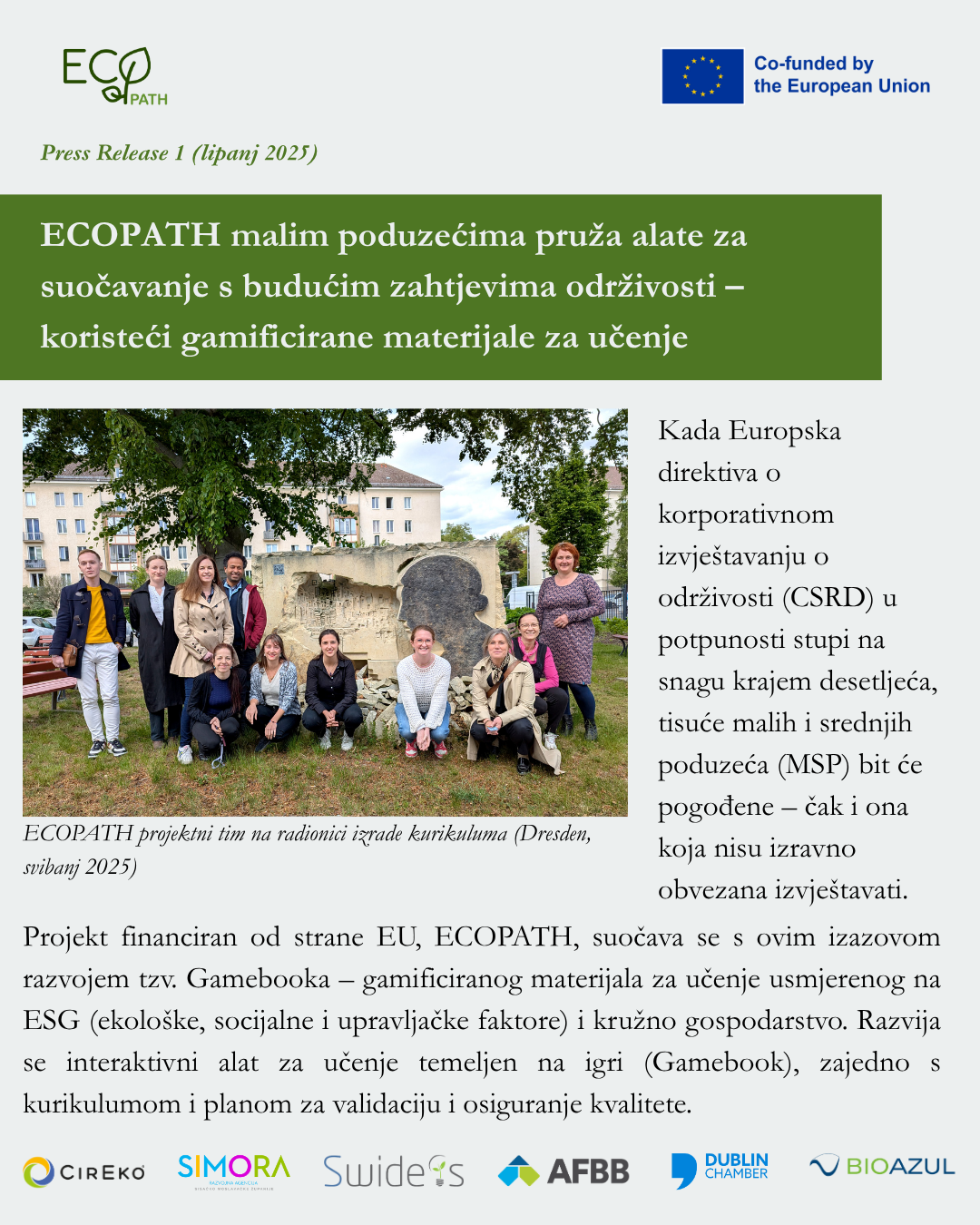 Podsjećamo, ciljevi projekta ECOPATH obuhvaćaju pružanje podrške malim i srednjim poduzećima kako bi se bolje pripremili za poboljšanje vlastitog utjecaja na okoliš, te stvaranje kapaciteta edukatora za odrasle osobe sa svrhom bolje integracije znanja vezanih uz kružno gospodarstvo. Projekt ECOPATH financiran je iz programa Erasmus+, u ukupnoj vrijednosti od 250.000,00 €, u trajanju od 30 mjeseci (2024. – 2027.), a okuplja partnere iz Švedske, Hrvatske, Njemačke, Irske i Španjolske.