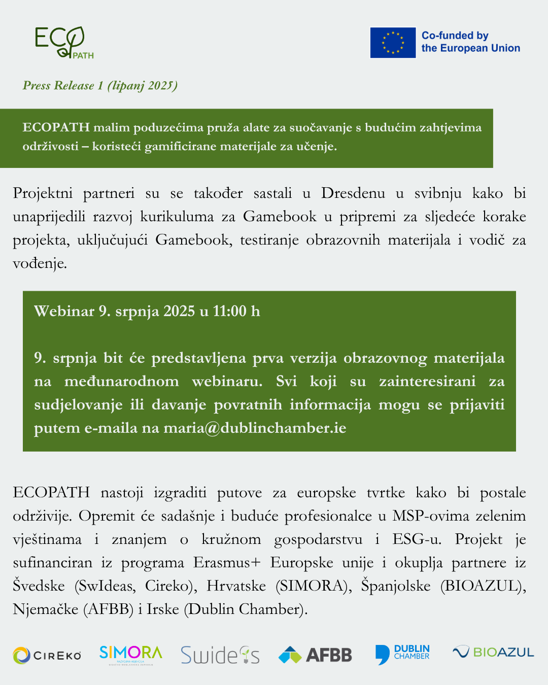 Ukoliko ste mali i srednji poduzetnik, ili startup-ovac, ili jednostavno želite naučiti više o održivim poslovnim praksama, pridružite nam se na besplatnom online webinaru 9. srpnja 2025. u 11:00 sati kako biste saznali više o prvoj verziji obrazovnih materijala i kako projekt ECOPATH može pomoći vašem poduzeću da se prilagodi održivim poslovnim modelima.