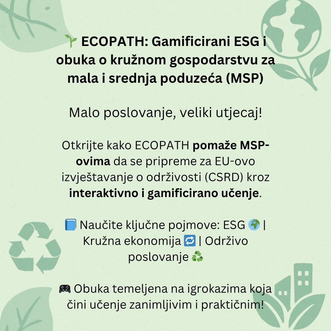 ECOPATH je Erasmus+ projekt koji, kroz inovativan pristup gamificiranog učenja, pomaže malim i srednjim poduzećima da razumiju i primijene principe ESG-a (okoliš, društvo, upravljanje) i kružnog gospodarstva u svakodnevnom poslovanju. Umjesto suhoparnih priručnika i teških propisa projekt ECOPATH ponudit će dinamičan edukacijski Gamebook – interaktivni priručnik razvijen kako bi pružio konkretne alate, znanja i vještine za održiviji rad i poslovanje.