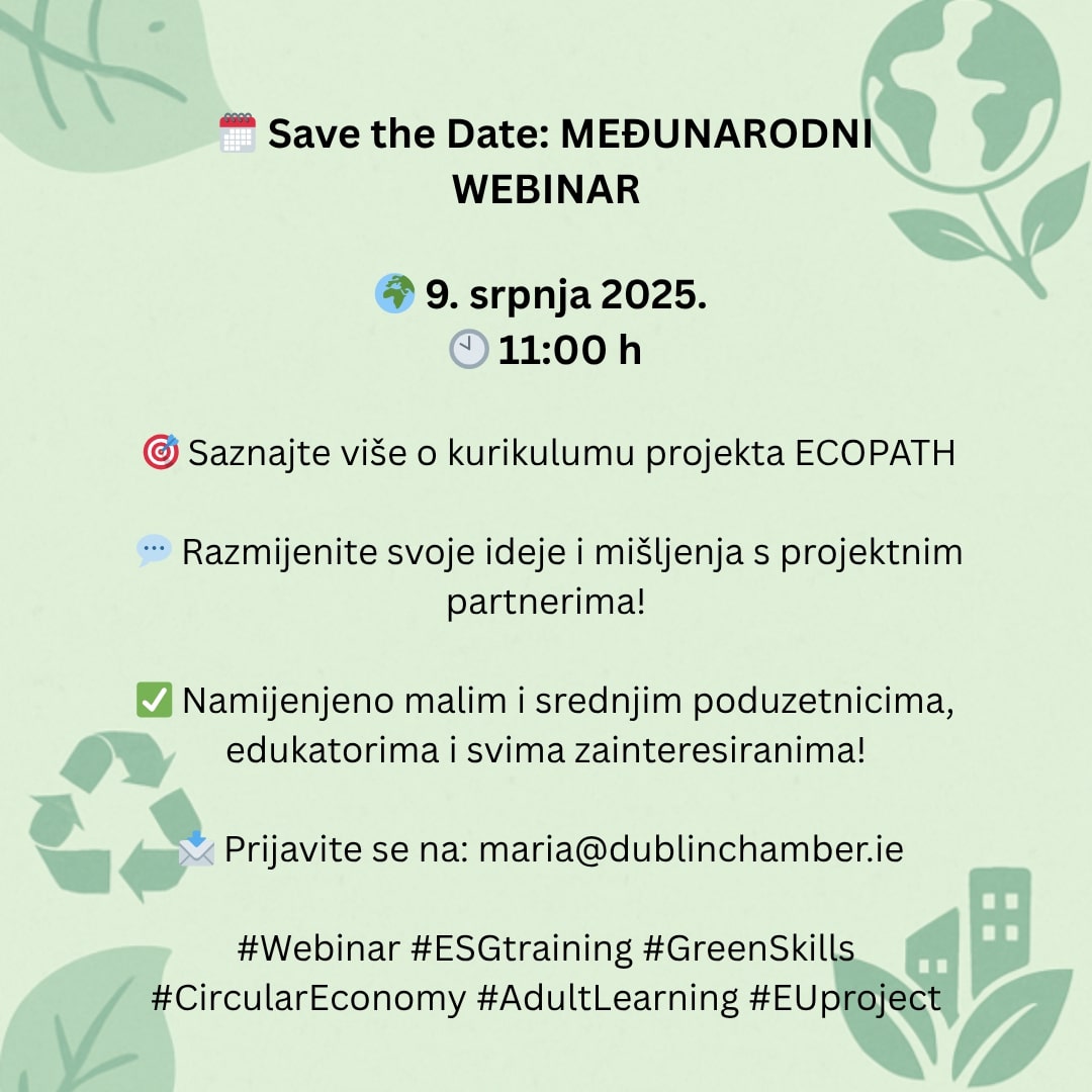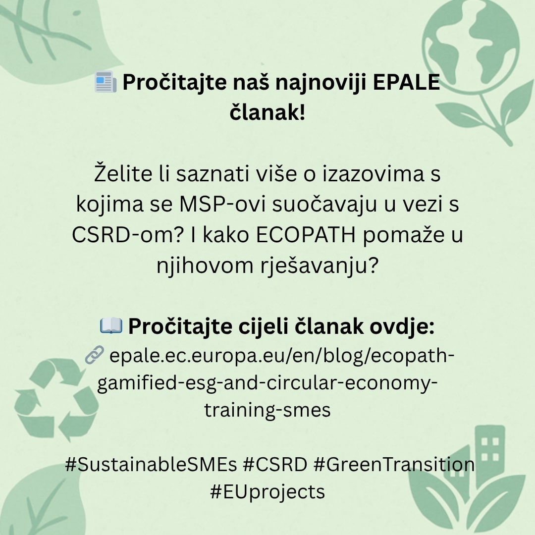 🚀U vremenu kada održivost postaje presudna za opstanak i rast poduzeća, ECOPATH nudi konkretna rješenja – kroz znanje, suradnju i pristup koji motivira. Ako ste dio svijeta malog i srednjeg poduzetništva, startupova, edukator za obrazovanje odraslih ili jednostavno želite razumjeti što nas čeka u održivoj transformaciji gospodarstva, ovo je idealna prilika da zakoračite na pravi put. Do tada, pročitajte članak objavljen na EPALE platformi koji govori o potrebi za razumijevanjem ove tematike: https://lnkd.in/dhuzdJtd (hrvatska verzija dostupna je ovdje: https://rk-smz.hr/odrzivost-esg-i-kruzno-gospodarstvo-za-msp-ove-saznajte-vise-o-projektu-ecopath/ )